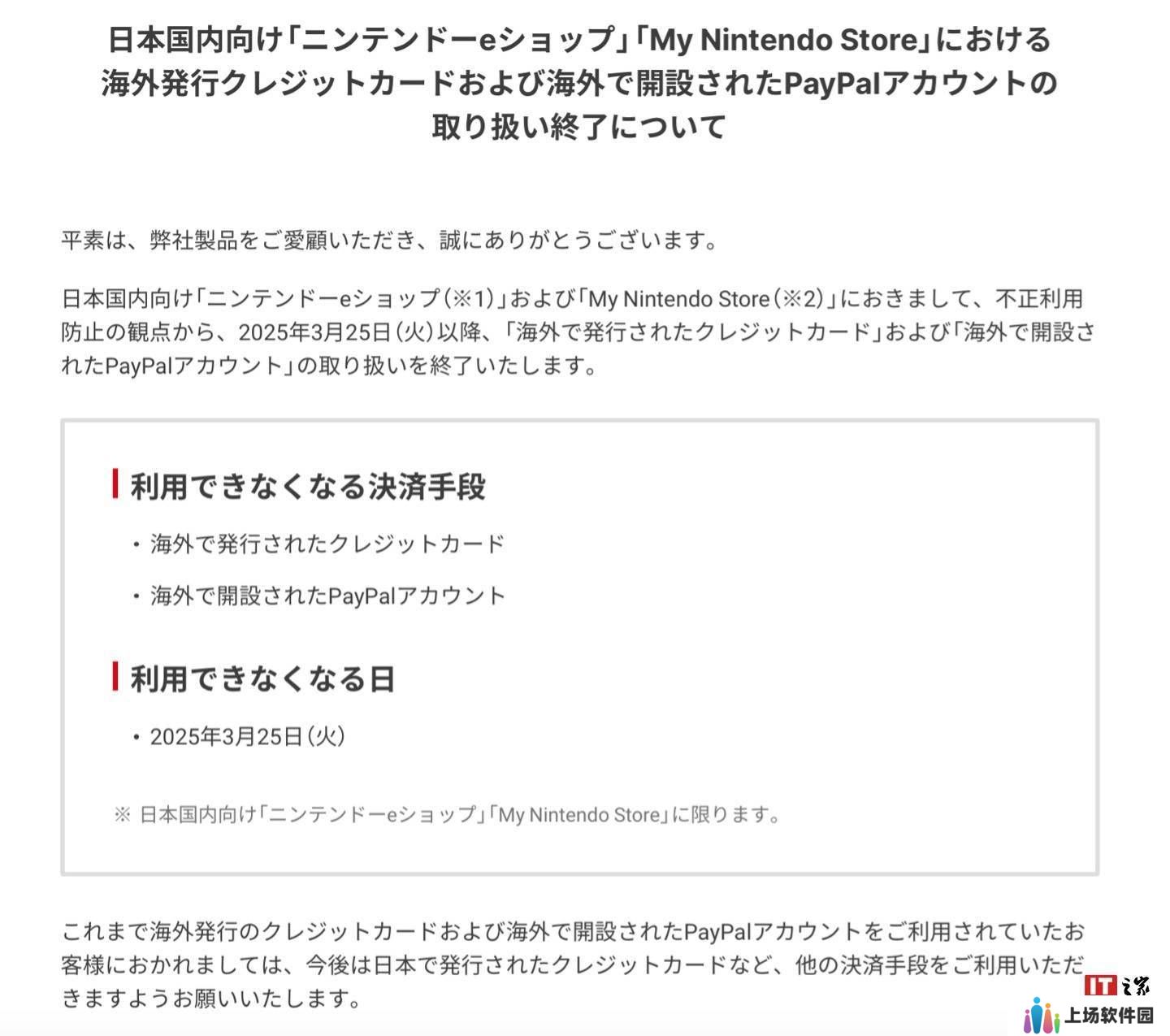 近日,任天堂官方在X平台上发布了一则重要通知,内容关乎其日服eShop及My Nintendo Store的支付政策调整。通知指出,从2025年3月25日起,上述平台将不再接受海外发行的信用卡或海外PayPal账号作为支付方式。